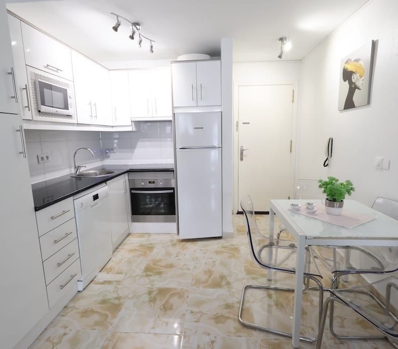 The layout of this 2 bedroom apartment with pool view in Torrevieja is designed for functionality within its 60 m² space. Entry leads into the main living area, which integrates the equipped American kitchen, creating an open environment for cooking and relaxation.